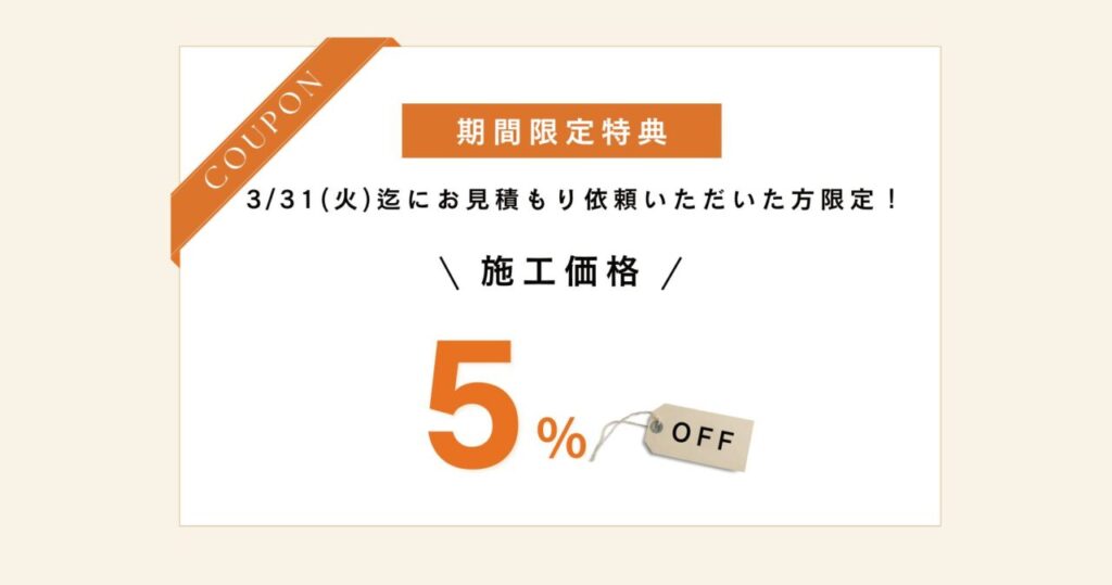 【3/31(火)迄にお見積もりいただいた方限定!】施工価格5%OFF!