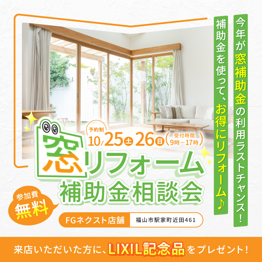 10/25(土)、26(日)の2日間、窓リフォーム補助金相談会を開催します。