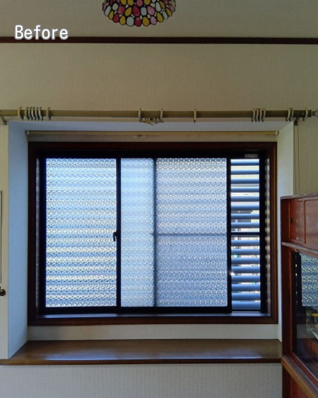既設サッシには模様ガラス(型ガラス)が使用されており、アルミサッシとの組み合わせで断熱性能が低い状態でした。